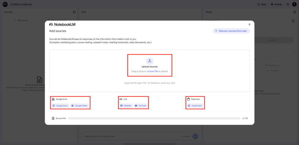 I could bring in files directly from my device (like PDFs, text files, or audio), pull from Google Drive (including Docs and Slides), paste raw text, or drop links from websites and YouTube. I’ve found it most effective to begin with just a handful of core documents, around three to five.