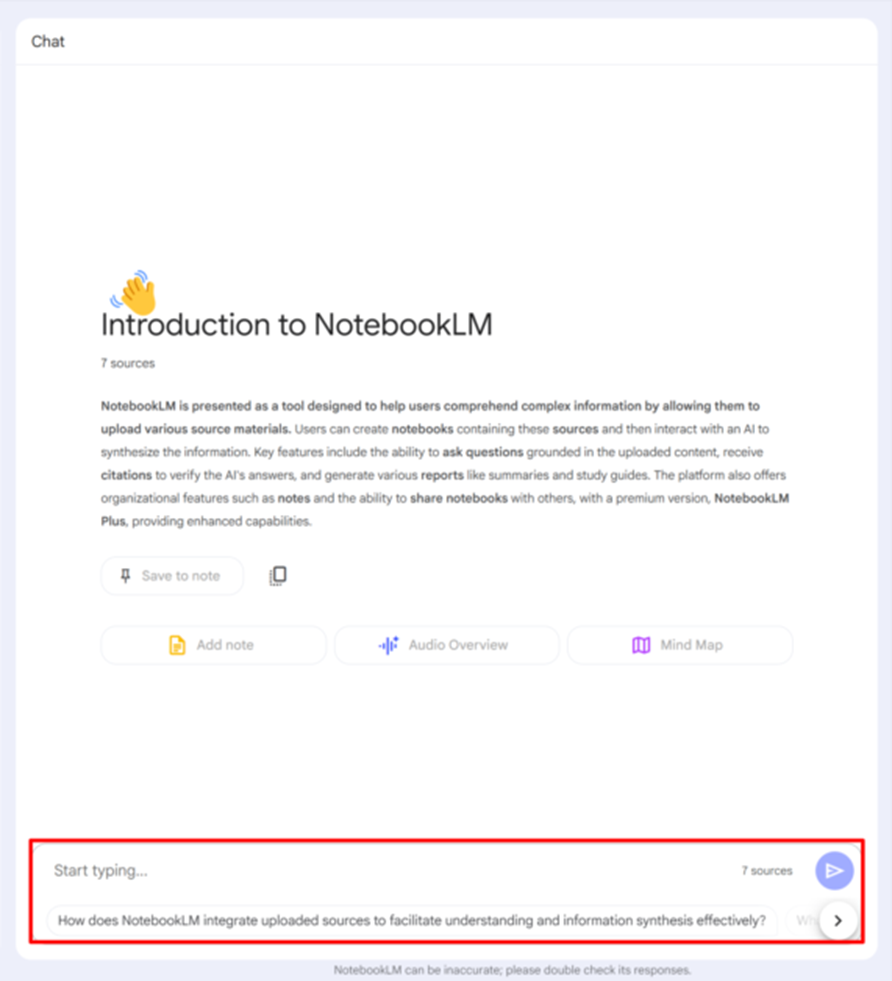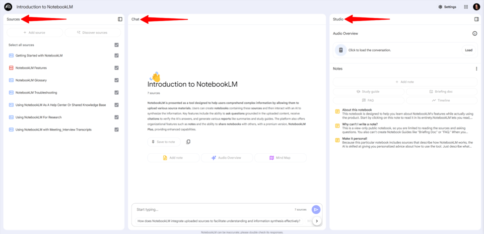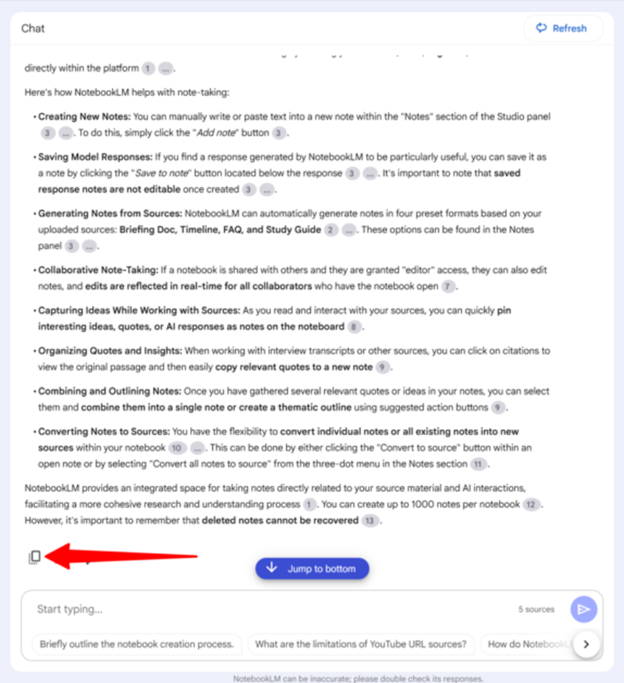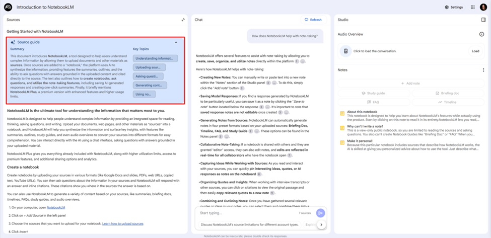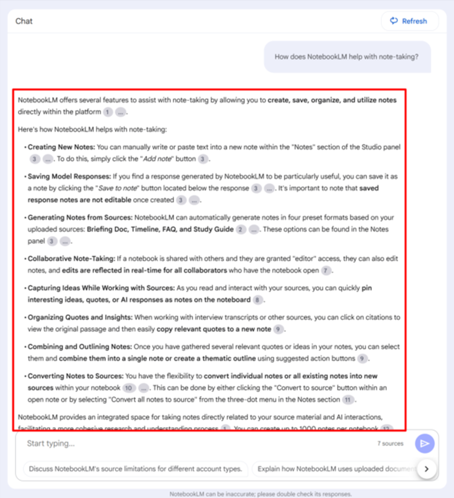 The main interaction in NotebookLM happens through its central chatbot, where users can ask questions based on their uploaded content. Specific prompts like “How does NotebookLM support note-taking?” generate more accurate responses than broad queries.