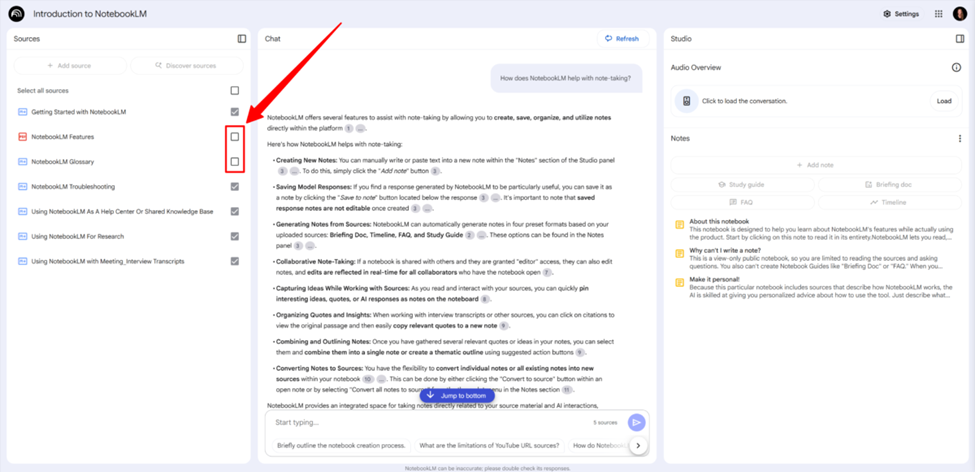 -NotebookLM intelligently draws information from all uploaded sources by default, ensuring responses are grounded in your provided content. However, if there’s ever a need to narrow the focus or exclude a specific document, you can simply uncheck it using the toggle next to the source name. This allows for greater control over which materials the AI references during your session.