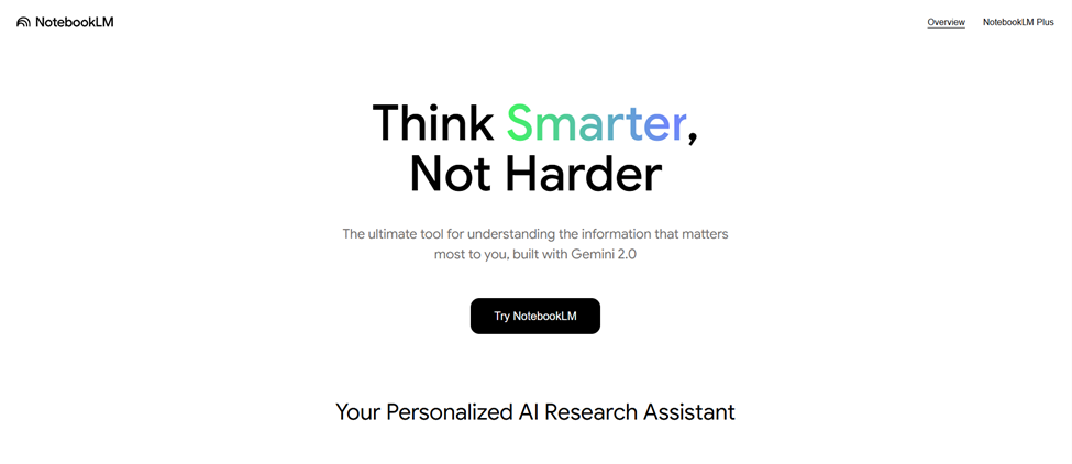 - NotebookLM is an AI-powered research and learning assistant developed by Google, designed to help users engage more deeply with their documents through summaries and contextual Q&A.